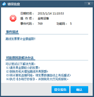 7、问题描述:开具发票时提示离线发票累计金额超限,具体提示如图。