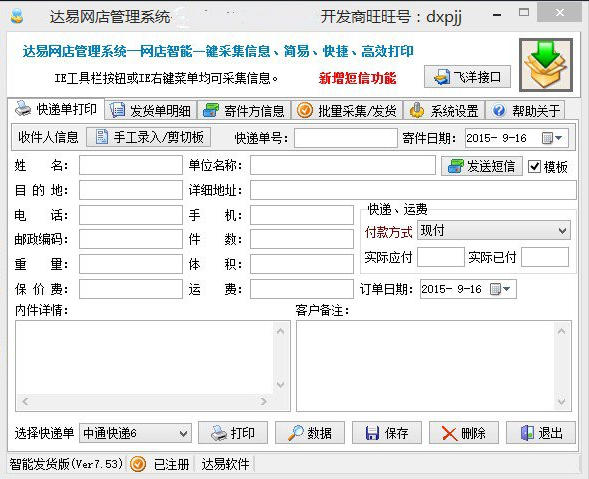 达易网店管理系统是一款能够帮助网店人员轻松的打印各种快递单,一键智能采集发货信息的工具。有需要的可以来天空下载使用!