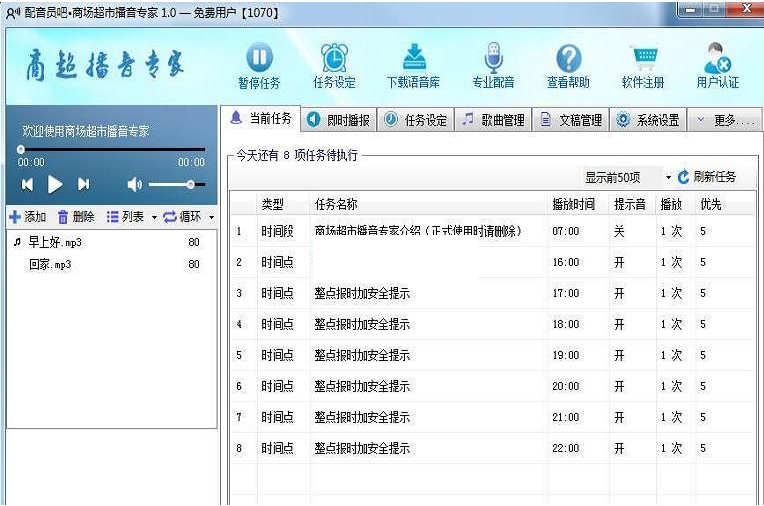 配音员吧商场超市播音专家是一款集音乐播放、文本转语音广播、定时播音等功能为一体的商场播音软件。功能强大,欢迎下载!