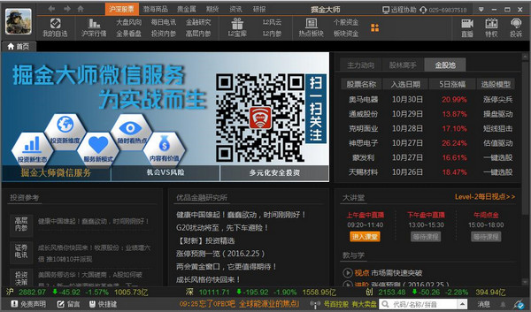 掘金大师是一款为用户带来了行情、工具、资讯、研究等等功能的炒股软件。功能完善,有需要的可以来天空下载使用!
