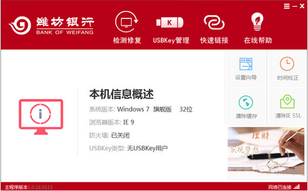 潍坊银行网银助手可以帮助用户来快速地对当前的网银使用环境进行检测,包括USBkey驱动、安全证书等等,同时还可以对检测到的问题进行一键修复,让你更加安全放心地在电脑上使用网银。