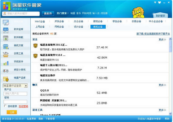 瑞星软件管家是一款内置海量最新最全最热的软件的工具。还可以帮助用户管理电脑的应用软件,一键下载、安装、卸载、升级等等。欢迎下载使用!