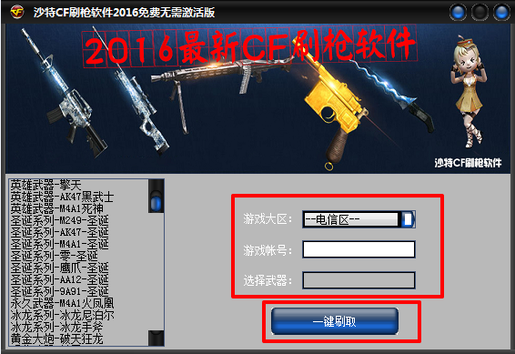 沙特CF刷枪软件2016免费无需激活版支持擎天、AK47黑武士、M4A1死神、AK47圣诞等等枪支给你免费刷。有需要的可以来此下载。