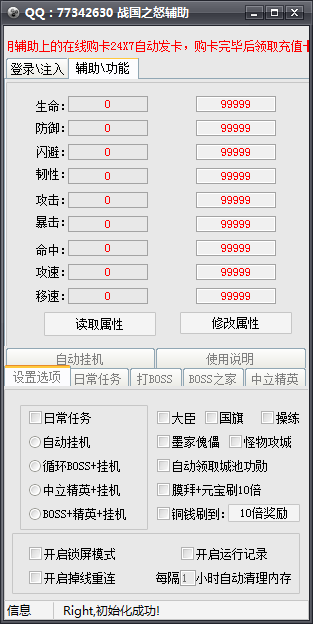 战国之怒挂挂辅助为玩家提供了签到领奖、日常任务、个人BOSS、练级喊话等等功能。让玩家可以轻松游戏,欢迎下载。