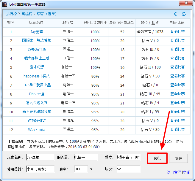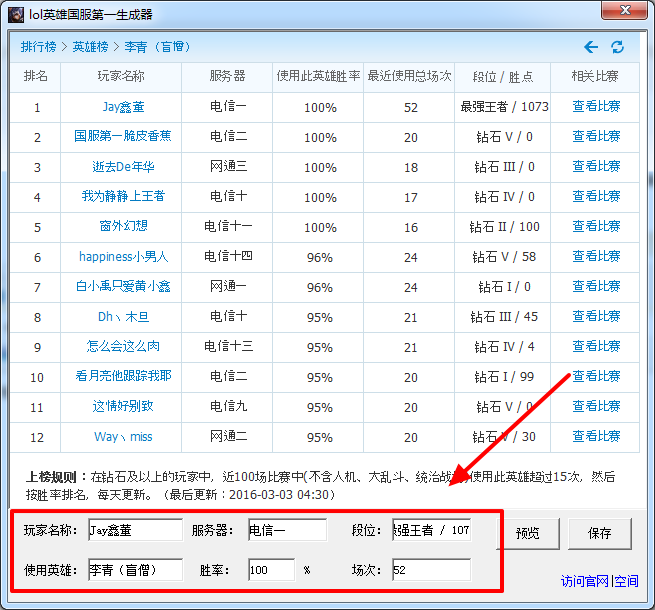 lol英雄国服第一生成器是一款英雄联盟的装逼工具。让你可以轻轻松松的上盒子的国服第一。LOL玩家装逼必备,欢迎下载。