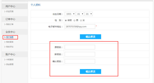 在用户信息中输入原密码和新密码,点击确认修改,密码即修改成功。
