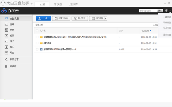 大白云盘助手是一款基于百度云下增强改进 集合第三方优质资源 云盘,播放,资源 一键搞定