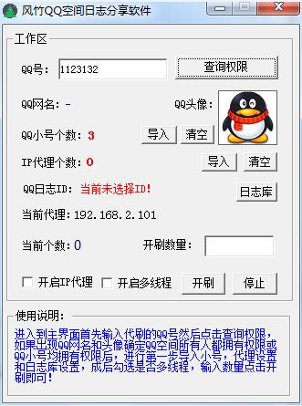 进入到主界面首先输入代刷的QQ号然后点击查询权限,如果出现QQ网名和头像确定QQ空间所有人都拥有权限或QQ小号均拥有权限后,进行第一步导入小号,代理设置和日志库设置,成后勾选是否多线程,输入数量点击开刷即可!