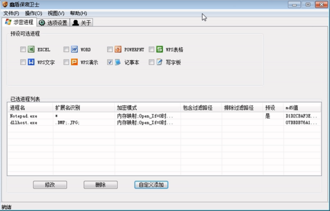 二、设置机密进程保护的加密方式,设置好后,该进程的一切操作都是加密运行,另存为,保存,复制,截图等,并不会影响您的正常使用。这样即使您的电脑让别人使用您的加密文档操作,或已被木马入侵的情况下,您的资料也是安全的,不用担心泄漏和传播您的文档等加密资料;