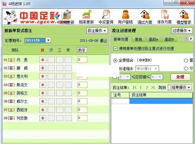 中国足彩网进球彩过滤软件是一款支持过滤方法,数据分析、过滤缩水、奖金计算、智能推荐、专家推荐等等功能的彩票过滤软件。功能强大,欢迎下载!