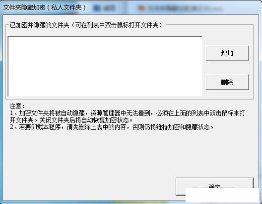 1.加密文件夹将被自动隐藏,资源管理器中无法看到,必须在上面的列表中双击鼠标才能打开文件夹,关闭文件夹后将自动恢复加密状态.