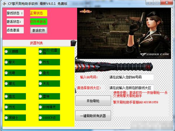 CF擎天刷枪助手软件是一款能够帮助用户刷取火麒麟、黑骑士、雷神、烈龙、龙啸、盘龙等等武器的工具。有需要的可以来此下载!