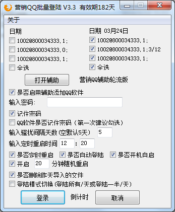 营销QQ批量登陆是一款支持自动登陆多个营销QQ,支持获取登陆失败的营销QQ的工具。以设置开机自启,自动登陆,自动重启等等。欢迎下载!
