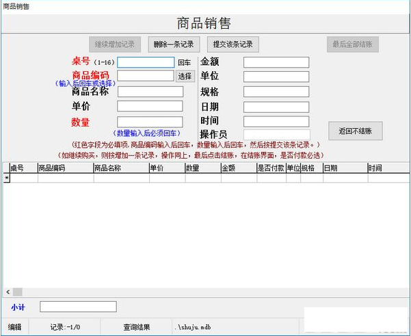9、销售商品功能,可以在桌球计费中销售饮料或烟或其他百货商品,并和某桌对应,可以对销售商品标记已付款或未付款操作。
