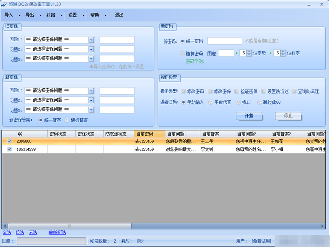 悠游QQ改保改密工具是一款功能强大的qq改密保软件。可以对多个QQ帐号进行批量修改密码、修改密保、验证密保、设置防沉迷、查询防沉迷。有需要的可以来此下载!