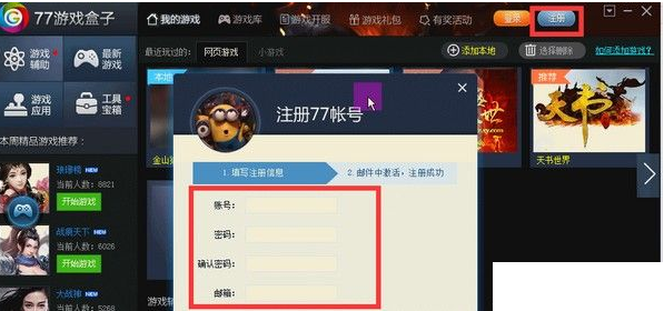 第三步,注册盒子账号(盒子账号和游戏账号是不同的,游戏账号用来登陆您的游戏,盒子账号用来登陆77游戏盒子),注册的时候那个邮箱就是用您QQ邮箱就可以了,不知道什么是QQ邮箱,请打开QQ,