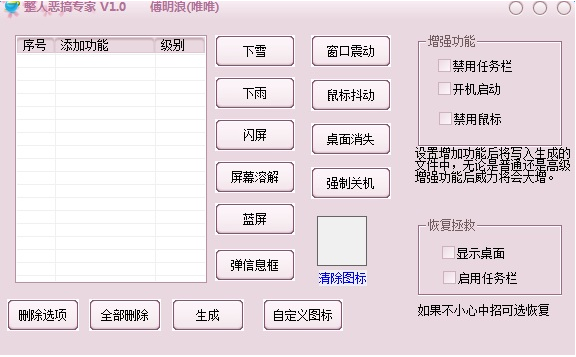 愚人节整人软件是一款非常不错的电脑恶搞软件。可以让你的电脑屏幕下雪、闪屏、弹信息框等。欢迎下载!