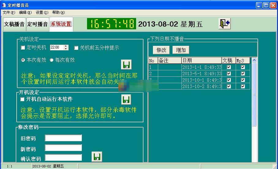 4、可以设置定时打铃(播放MP3声音文件),特别适合幼儿园、小学、中学、大学等当做校园铃声及校园广播。