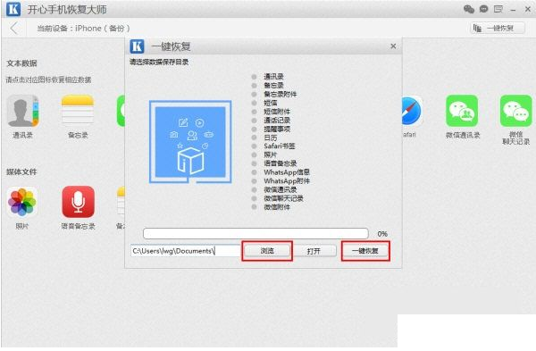 第四步:点击【浏览】选择恢复数据的路径。【一键恢复】则开始恢复。