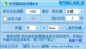小贝鼠标连点器是一款能够帮助用户自由设置单击鼠标间隔时间及单击方式(左键、中键、右键)的实用工具。有需要的可以来此下载!