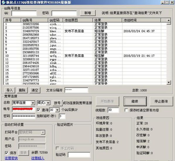 软件无插件,无需安装,解压后即可使用,可查询出全部状态的QQ号码,QQ号码冻结也分很多种,如违规操作、涉嫌批量注册、发不良信息等等,这款QQ冻结查询软件可以查询到QQ冻结详细情况,以及号码解冻的方式类型如下:【正常号码】【短信解冻】【改密解冻】【验证码解冻】【永久回收】等!