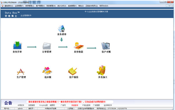 以企业内部的流程化管理思想,以流程为核心,从业务接单到产生派工制作,到生产完成,订单交货,最后产生应收帐的整套完整流程,各流程之间的数据可以上下追溯,而不是简简单单的开单打印功能而已。例如:作为厂部,车间可以随时调出订单信息,包括订单要求的图样、尺寸、项目、交货日期等信息;作为门市,可以随时了解到订单的生产进度,完工日期,可以随时了解到客户的欠款信息及信用额度作为财务部,可以随时了解到订单的预收款、已收款、以及欠款,可以及时催收账款,降低风险。通过业务信息的整合,同时也避免了接单后白干活,或者是没人干的情况。