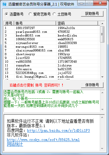 1.8 修复取不到爱奇艺账号的问题,再再次修复错误 这次应该是最终版本了 起码短时间内不用再频繁更了,修复1.6 取不到账号的BUG 因为本程序是取别人网站上的账号 如果网站改变了发布账号的规则 就有可以会出错 本次更新增加了一个获取网址可随时切换 我会尽可能减少出错的机率