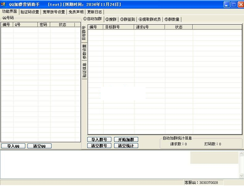 自动加群功能,导入一批QQ号设置好参数,以及验证信息,点击开始加群,软件即可24小时全自动添加。