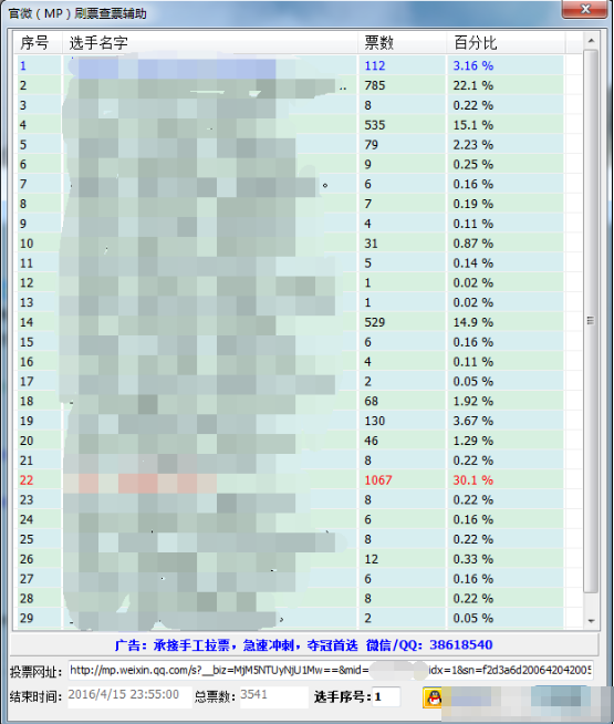 5.鼠标点击票数列 时,软件将自动按照票数排序;