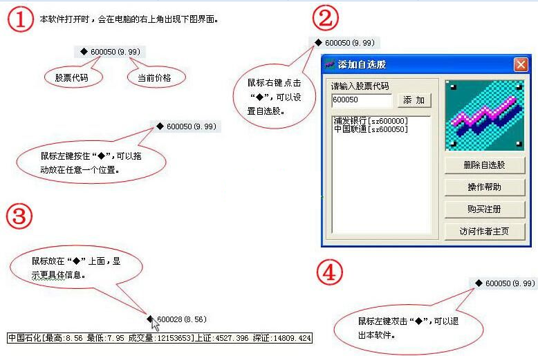 (1)双击打开本软件后,会在电脑右上角出现如下图界面,“600050”为股票代码(中国联通),括号内数字为当前价格。