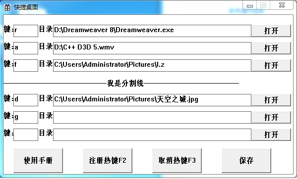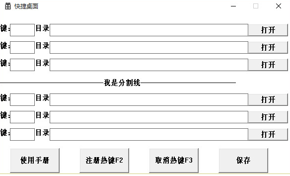 快捷桌面是一款以自定义快捷键连接电脑程序以及文件,也可以用来打开文件夹的实用工具。可以注册系统热键,即使本程序没有被激活仍能使用热键打开连接的文件。欢迎下载使用!