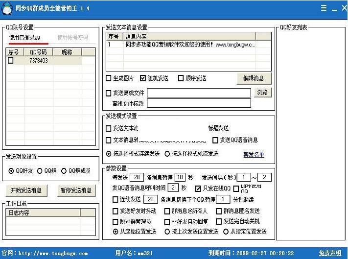 同步QQ群成员全能营销王是一款支持批量自动登录QQ、QQ信息群发(QQ好友;QQ群;QQ群成员)、支持群成员弹语音群发、软件支持记忆功能、支持离线文件群发、支持多QQ切换等等强大功能的qq营销软件。欢迎下载!