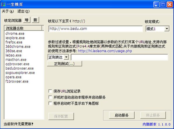 1. 强力锁定各种浏览器首页(并不是简单的修改浏览器启动参数或具体浏览器的主页设置来实现锁定),经过测试的浏览器包括:微软IE6.0-11.0,火狐,谷歌浏览器,360极速浏览器,360安全浏览器,猎豹浏览器,遨游浏览器,QQ浏览器,百度浏览器,搜狗浏览器,Opera, F1浏览器等...,一生锁页可以针对市面上的任意一款浏览器进行锁定;