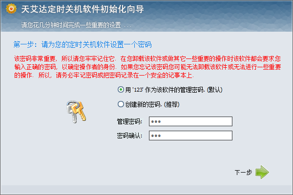 4. 输入原始密码然后两次输入新密码便可成功地修改天艾达定时关机软件的管理密码.