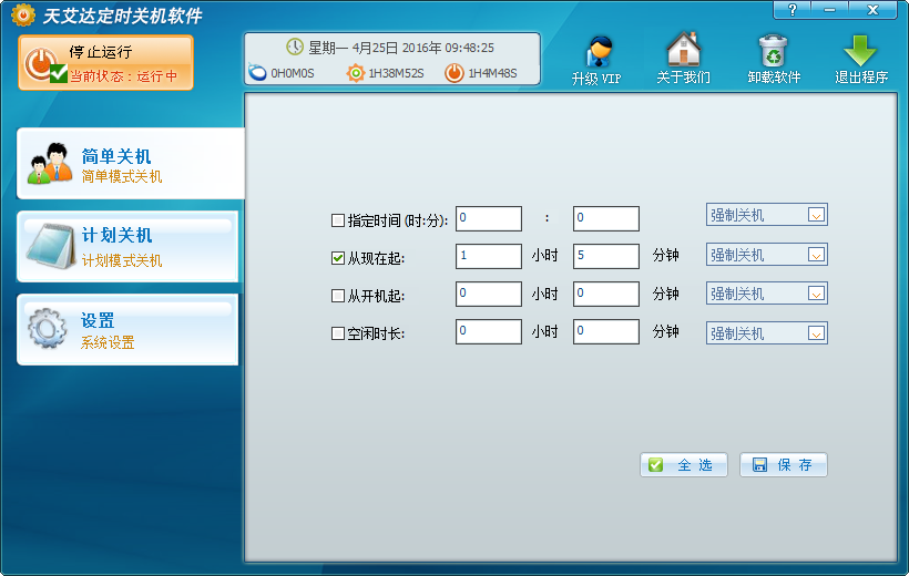 作为一款功能强大的定时关机软件,天艾达定时关机软件为用户们提供了完善的定时关机功能,软件完美的支持隐藏在计算机后台运行,不会占用电脑内存,而且软件还为大家提供了VIP版本,升级以后可以获得更加强大的功能。