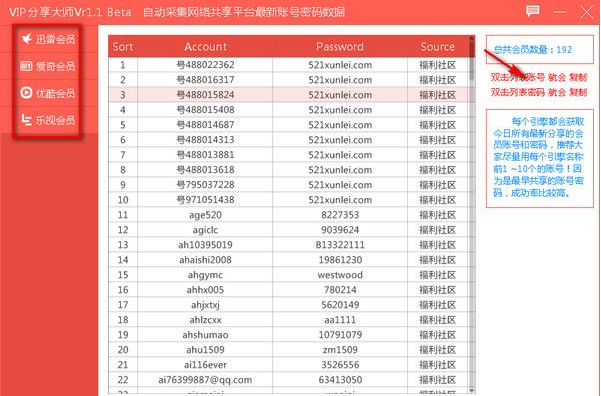 2.等待软件获取完毕,双击列表账号即可复制使用.