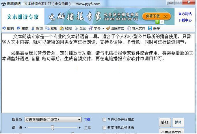 配音员吧文本朗读专家是一款相当专业实用的文本朗读软件。功能强大,操作也是非常的简单。有需要的可以来此下载!