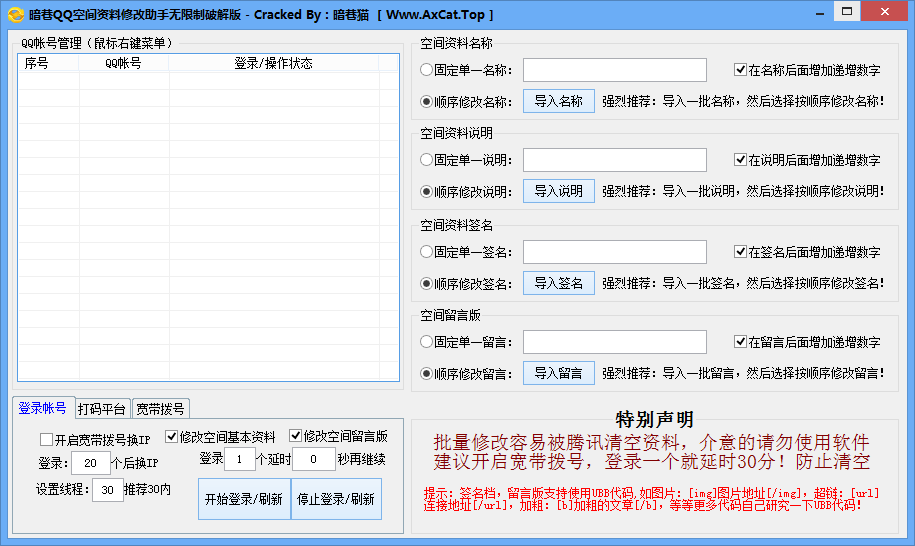 暗巷QQ空间资料修改助手是一款批量修改qq空间资料的工具,功能强大,可以进行批量使用,有需要的可以来天空下载使用!