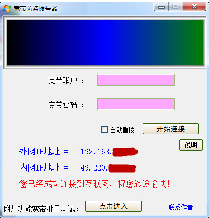 宽带防盗拨号器是一款专业实用的宽带拨号软件。能够自动检测是否在线,把拨号前面的单选框选上,不在线就自己拨号。欢迎下载使用!