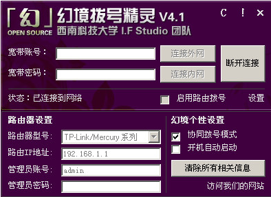 幻境拨号精灵是一款功能强大,使用方便的网络拨号软件。支持加密账号明文复制等等,可以手动填写账号进行路由拨号。有需要的可以来此下载!