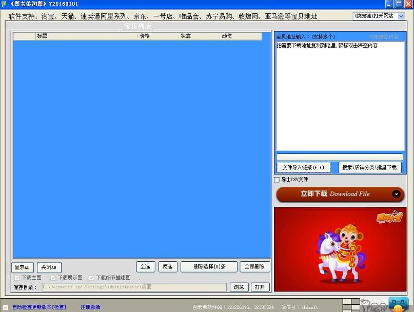 图老弟淘宝天猫图片下载器可以轻松实现淘宝图片批量下载、淘宝商品大图下载 ,极大的方便的店主对店铺的素材管理。 此软件可以一键下载阿里系列宝贝图片包含主图(sku)、展示图 、细节描述图等,同时该软件也支持速卖通图片下载、京东网图片下载、苏宁易购图片下载、唯品会商品图片下载、一号店商品图片下载等,能有实现多个链接同时同步下载。