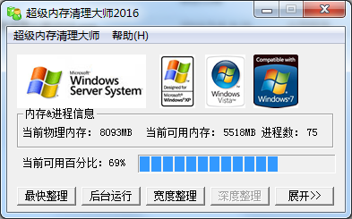 超级内存清理大师具有内存扫把的整理方法外还具有更为快速的最佳整理方式(几乎不占cpu的整理方式),以及普通内存整理软件的深度整理方式(不建议使用),而且增加人性化设置,允许用户在高级设置里面来修改整理的频率和方式,本程序热键默认为alt+z, 软件还可以对系统进程进行监测,可以查看进程路径,属性,在线查看进程信息,终止进程,新建进程等,方便用户随时关心自己的进程是否染毒,同时本程序还支持换肤功能。