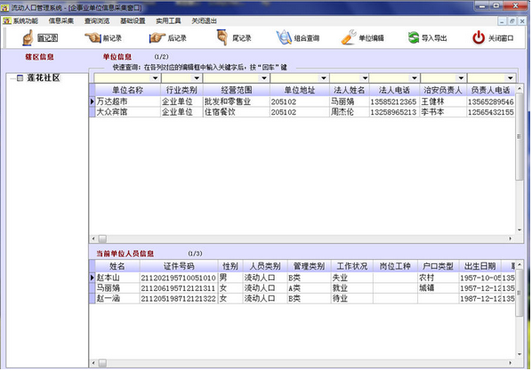 2 流动人口信息管理:对辖区流动人员信息的管理,以不同的方式浏览辖区的房屋及流动人员信息,可以按辖区;小区;楼幢;房屋;人员的级联方式(以防找人)查询,也可以按人员;房屋;辖区的方式(以人找房)查询。信息录入完毕后,自动生成“流动人员信息登记表”。