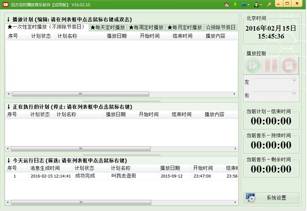 远方定时播放音乐软件是一款能根据用户的自定义设置来控制音乐播放的时间段的工具。支持定时关机,定时重启,且占用资源较少,欢迎下载!