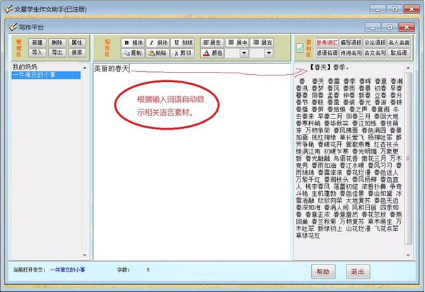 在该平台上学生一边写作一边就能获得自己所需的各类语言素材,方便贴心,高效快捷,这也使《文星学生作文助手》成为国内第一款具有"随写即随得"-即不需用户查找、具有智能自动提供素材功能的写作辅助软件。