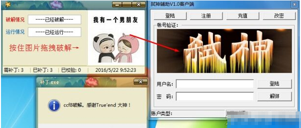 1、先打开补丁,再打开辅助!然后将图片拖到辅助界面!