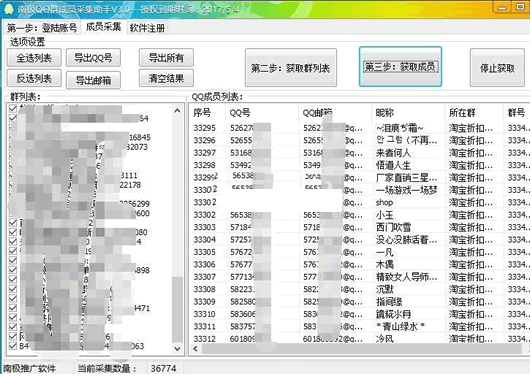 南极QQ群成员采集助手是一款通过快速智能的采集登录QQ的己加QQ群,获取己加群成员的QQ号,邮箱,昵称,所在群,群号等信息的工具。欢迎下载!