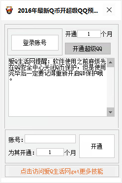 2016最新Q币开超级QQ工具是一款可以快速帮你开通超级qq的工具。你要开通几个月自己填写就可以,欢迎下载使用!