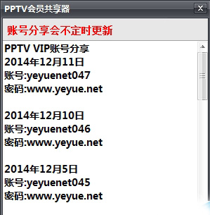 pptv会员账号共享是一款PPTV账号获取工具,工具为绿色版本,无需安装即可使用,主要功能可帮助用户无需费用免费获取到PPTV的会员账号,从而享受免费的会员服务,看视频无广告更加的畅快。所以网上有很多免费提供会员账号分享,比如爱奇艺最新VIP账号、还有乐视VIP账号共享、优酷黄金会员账号共享、迅雷VIP账号共享等给大家免费观看!