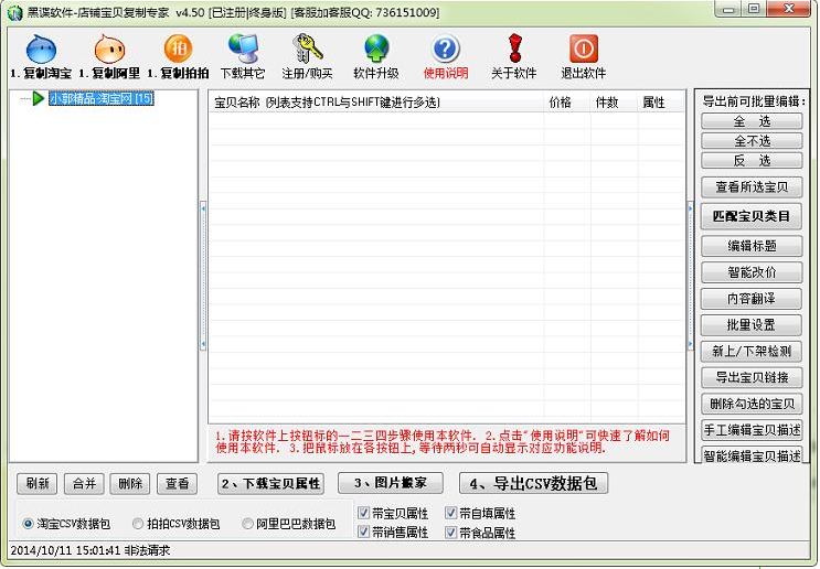 1、同时支持复制淘宝、天猫、阿里巴巴或拍拍四类店铺,并且支持相互转换数据包。